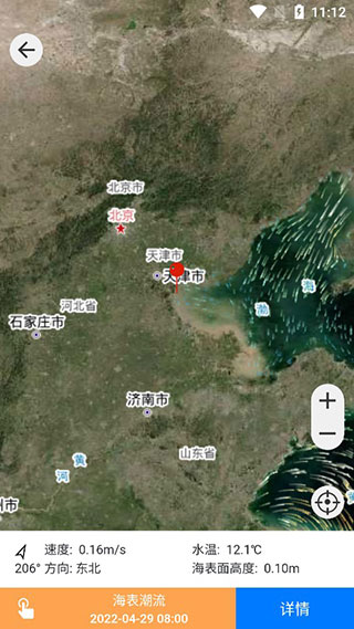 6、数据地图,可以查看全球的海表潮流、速度、方向、水温、海表面高度,点击详情查看天气、潮汐、海浪、表面洋流、深层洋流、微生物。