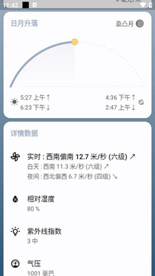 2、在主页往下拉就是刷新,主页上的信息非常齐全,“每日概览”点开就是15日的预报数据,每日概览下面是“小时概览”、“空气质量”、“日月升落”、“详细数据”;