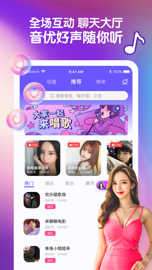 聊聊是一款聊天社交APP,用户可以通过语音和众多平台小哥哥小姐姐在线互动,也可以观看各种高颜值、多才艺房主视频直播,和主播在线聊天互动,休闲交友、音乐唱歌、吹牛吐槽、嗨歌喊麦、游戏娱乐、舞蹈综艺等多种休闲类型随意选择,对自己的声音有自信,可以加入闲聊交友房间,在线抢麦占位,通过声音和众多声音甜美的小姐姐在线闲聊,喜欢唱歌,还可以加入音乐唱歌房间,用歌声结识更多有趣的朋友,更多同好,让您通过平台轻松找到聊天的感觉,度过更加欢乐的休闲时光。