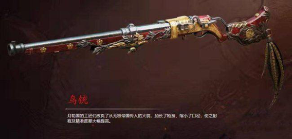 5、鸟铳:月轮国的工匠们对从无极帝国传入的火铳进行了改良,如加长了枪身、缩小了口径,使其射程及精准度都大幅提高。使用该武器时,可以远距离进行精准的狙击,但在短射程内的伤害相对较低。因此,在使用鸟铳时,需要使用者充分发挥其远距离狙击的优势,避免在近距离与敌人正面交锋。
