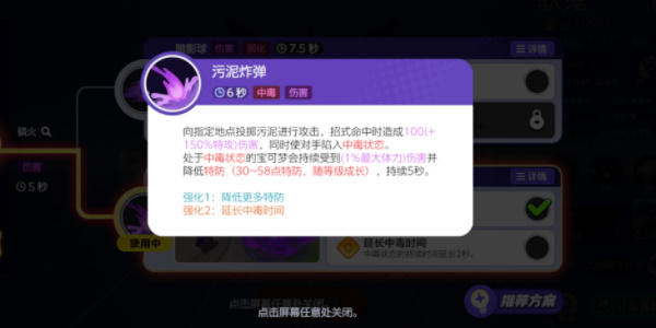 向指定地点投掷污泥进行攻击,招式命中时造成100(+150%特攻)伤害,同时使对手陷入中毒状态。 处于中需状态的宝可梦会持续受到(1%最大体力)伤害井降低特防(30~58点特防,随等级成长),持续5秒。