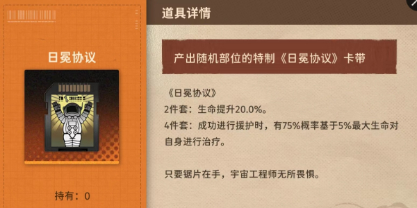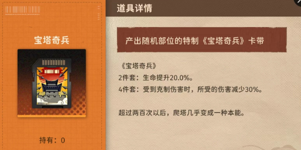 4件套:每个行动序列首次受到伤害时,所受伤害减少10%,首次被添加负面效果时,提升自身30%的效果抵抗。