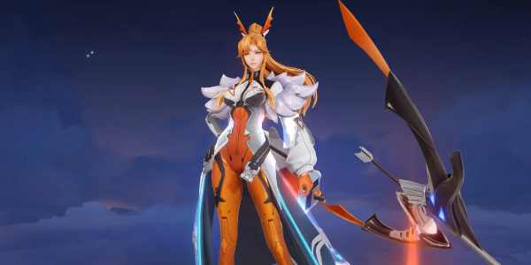 伽罗一头橙黄色的高马尾尽显飒爽青春。机械质感的战斗服搭配光泽材质的长款风衣,时尚与力量感兼并!整体设计上融入了大量战队元素装饰,手臂上的深圳DYG的战队徽章,箭袋上趴着可爱的战队吉祥物小鲨鱼,下方还有超大的DYG字样,发冠上的鱼鳍装饰生动又充满活力。服装和武器上也采用了非常多的“鲨鱼”纹样。风衣后侧下摆还有一只可爱小猪,象征着深圳DYG代表选手@深圳DYG丶钎城。
