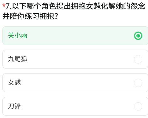 问题7:以下哪个角色提出拥抱女魃化解她的怨念并陪你练习拥抱?