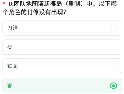 10、团队地图清新椰岛(重制)中,以下哪个角色的肖像没有出现?