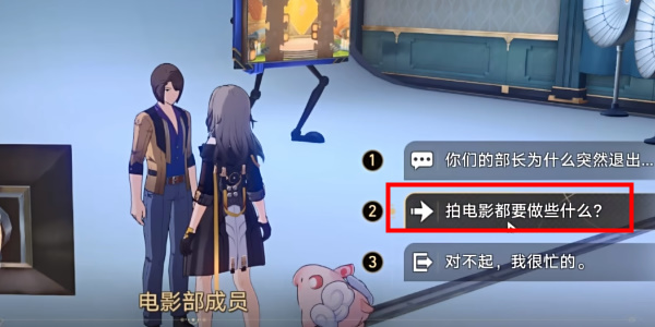 3、进入教室后和电影部的成员对话,选择“拍电影都要做些什么”。