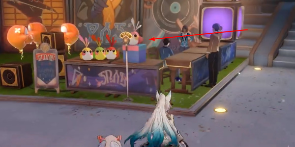 5、退出活动页面后我们向后转,来到下图标记的摊位前,和桌子上的折纸小鸟对话,对话结束后就可以解锁成就【折纸浩室】了,如果没有出现成就我们就返回活动界面再继续换一首歌,然后再和折纸小鸟对话,直到达成成就即可。