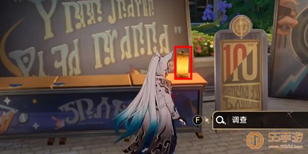 2、出锚点后我们向前走,然后在左侧可以看见一个桌子上有一个黄色的灯,靠近后点击“调查”。
